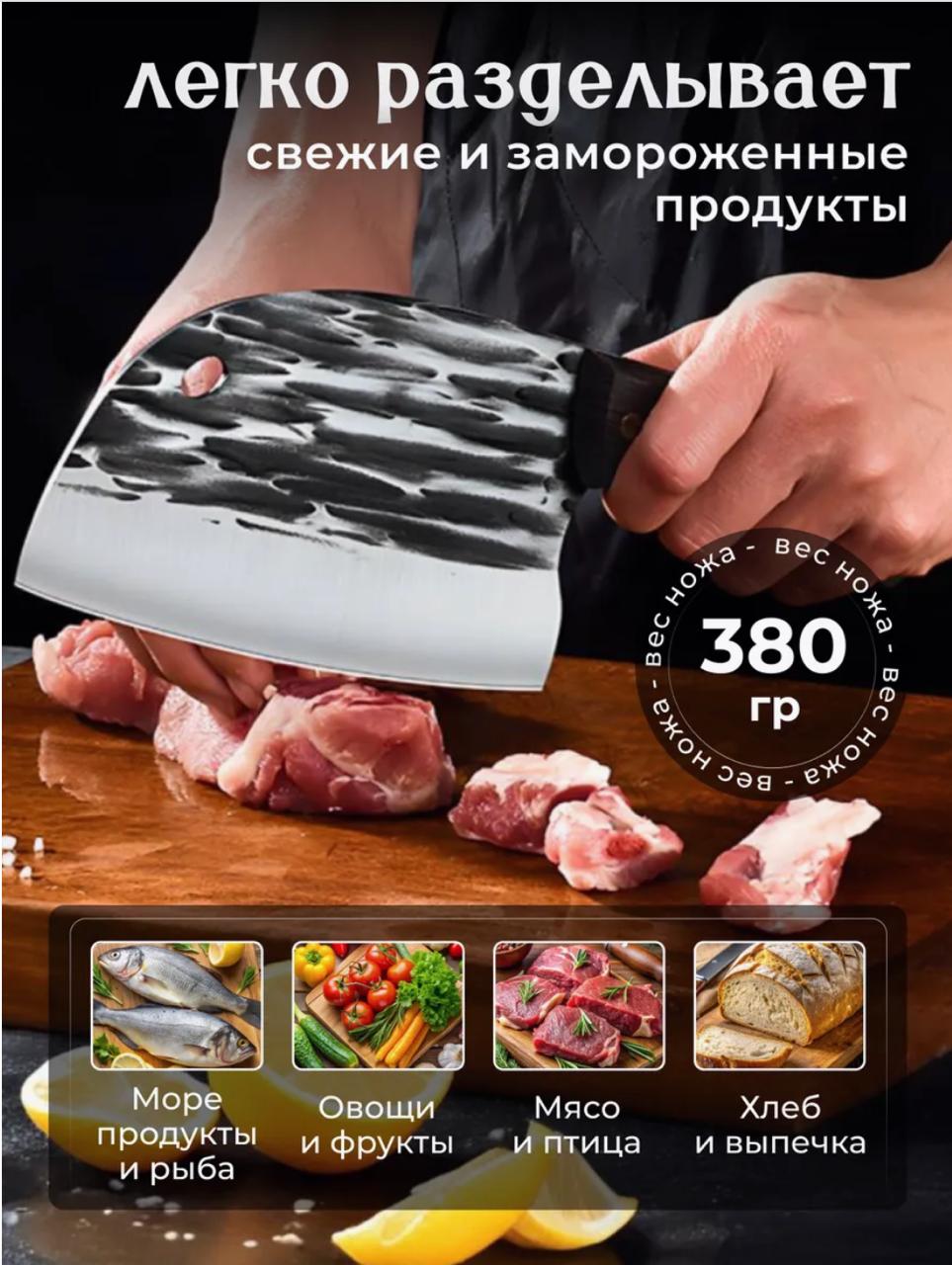 нож для разделки мяса, рыбы, овощей. Его нестандартная форма выгодно отличает его от других кухонных ножей.Вам не потребуется камень для заточки ножей, высококачественная двусторонняя заточка лезвия будет долго сохранять его изначальные режущие качества. Само лезвие выполнено из нержавеющей стали с высоким содержанием хрома.Уникальная конструкция делает его прочным и долговечным. Является идеальным помощником для мясников.Говорят, что дарить ножи, это плохая примета. Однако мы уверены, что этот нож кухонный настоящий подарок для ценителя качественной посуды и в целом товаров для дома и кухни.